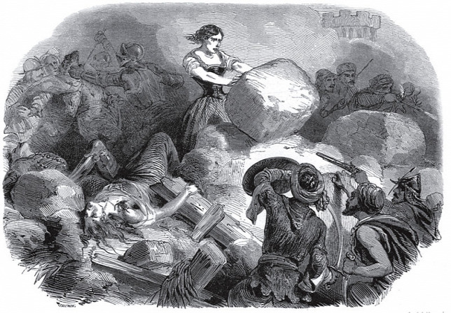 Amikor egyre több védő hanyatlott holtan a vértől síkossá vált kövek közé, a falakra forró vizet és szurkot tartalmazó üstöket cipelő hőslelkű egri asszonyok ragadták fel az elesettek szablyáit, és vérszomjas dühvel, hangosan sikoltozva vetették rá magukat a törökökre.