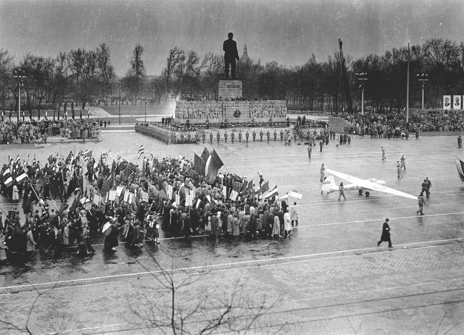 Budapest dolgozói 1954-ben a Sztálin-szobor alatt kiképzett dísztribün előtt táblákkal vonulnak a május elsejei seregszemlén (Magyar Fotó: Mező Sándor)Gerő Ernő rádióbeszédének híre azonban futótűzként terjedt közöttük és hatalmas felháborodást gerjesztett.