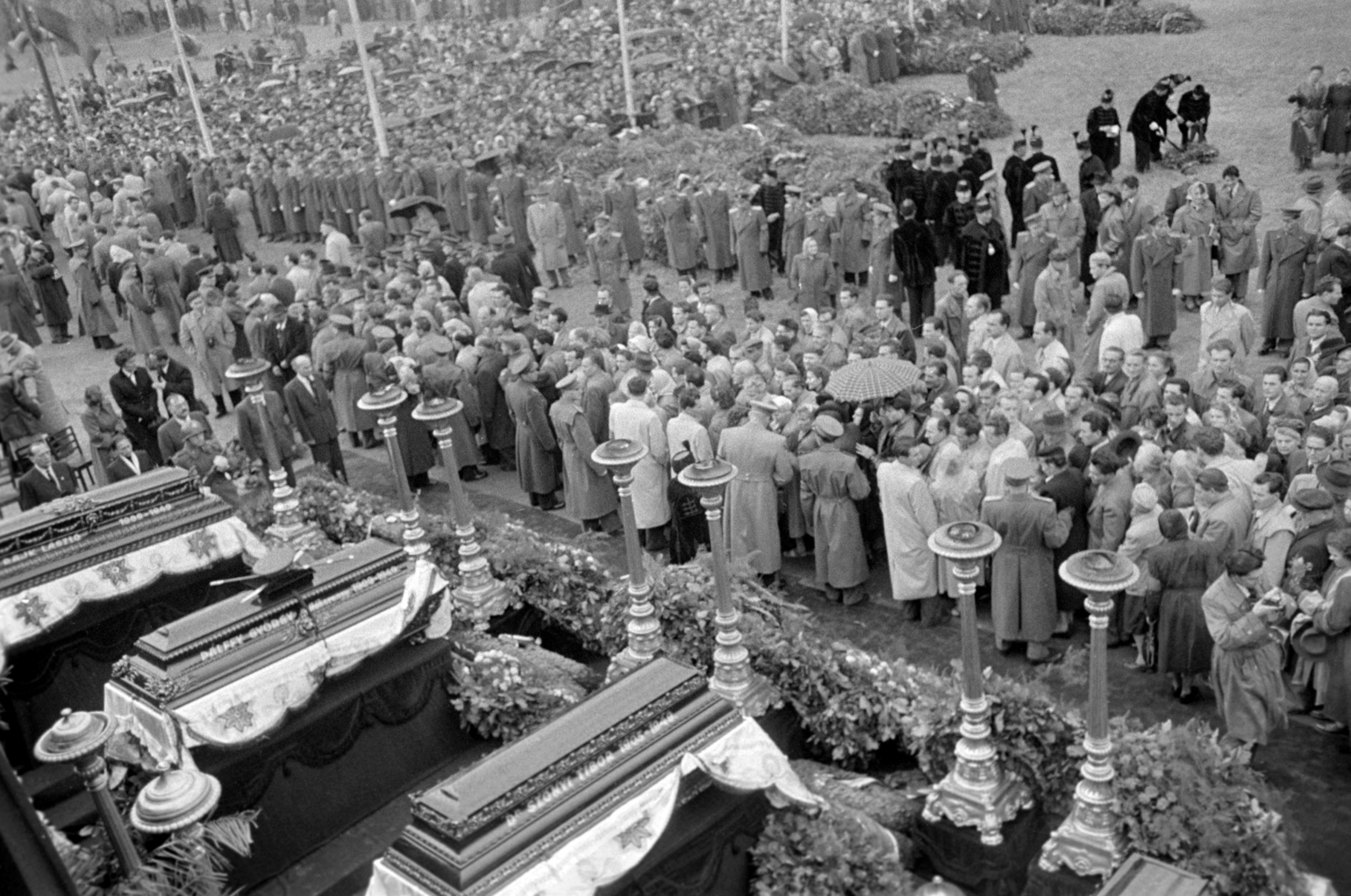 Budapest, 1956. október 6. A gyászoló tömeg a koholt vádak alapján 1949-ben kivégzett, de 1955-ben rehabilitált Rajk László, Pálffy György, Szőnyi Tibor és Szalai András ravatala előtt a Kerepesi temetőben, ahol katonai gyászpompa mellett helyezték őket örök nyugalomra (Fotó: MTI/Tormai Andor)Az események ettől kezdve felgyorsultak: október 16-án Szegeden újjáalakult az első, kommunistáktól mentes ifjúsági szervezet, a Magyar Egyetemisták és Főiskolások Szövetsége, amelyhez másnap Budapest, Sopron, Pécs és Miskolc egyetemistái is csatlakoztak.