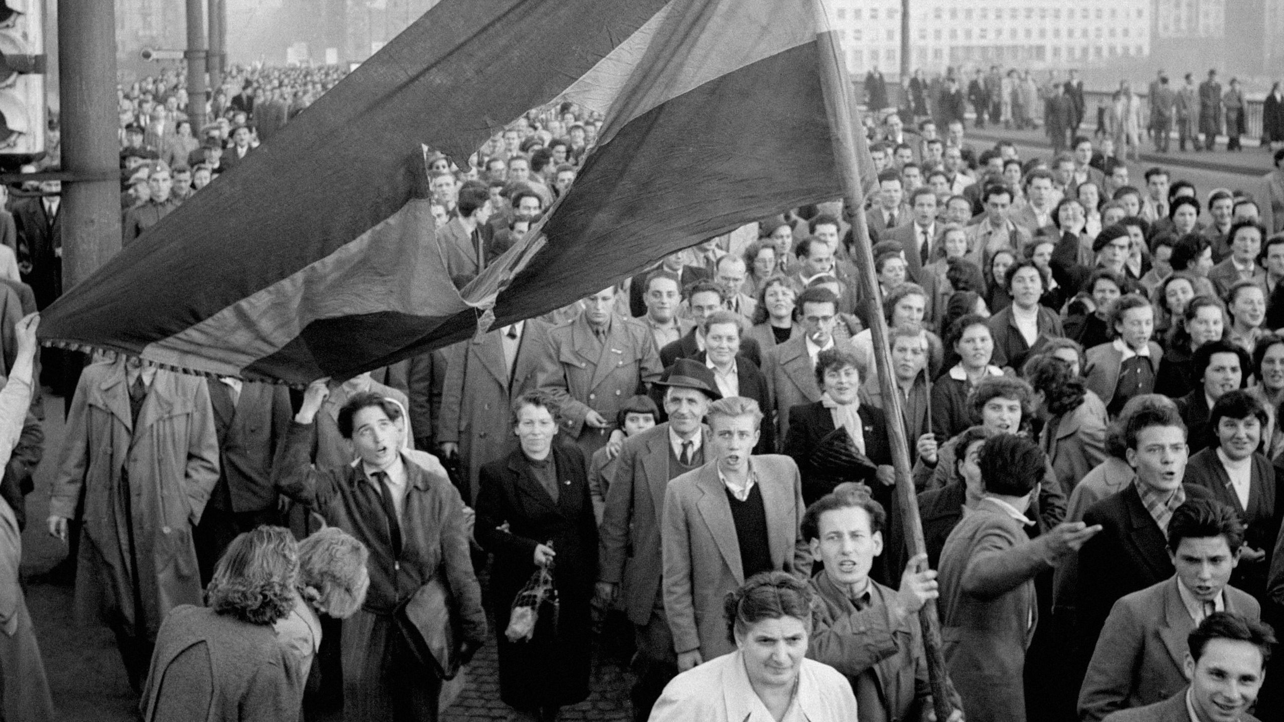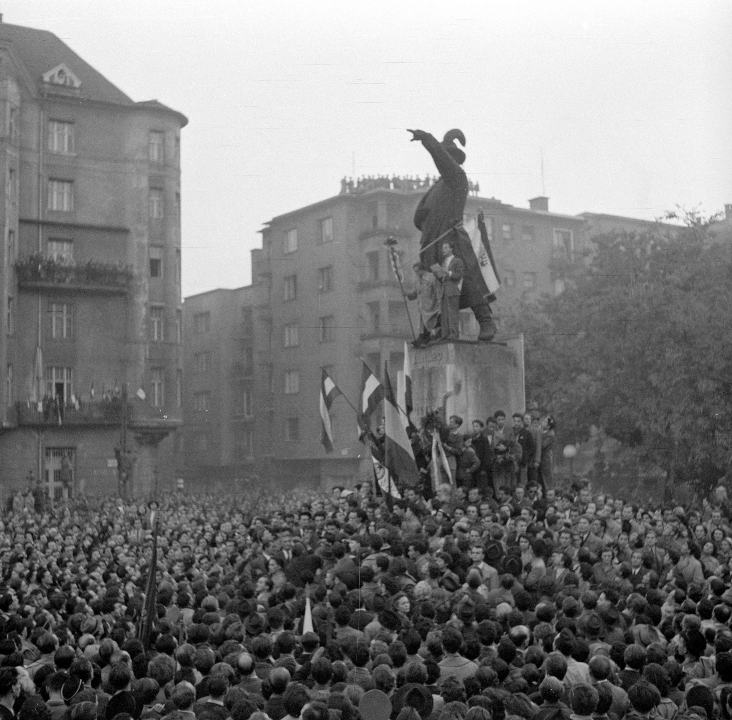 Tüntető tömeg a Kossuth téren a Parlament előtt az 1956-os forradalom idején, a lengyel–magyar nép barátságát éltető, provokátorokat elítélő transzparensekkel, valamint Nagy Imre portréjával (Fotó: MTI/Munk Tamás)A Kossuth téri eseményekkel egy időben Budapest egy másik pontján is hatalmas tömeg gyűlt össze. A Dózsa György úti Sztálin-szobornál is legalább százezer ember demonstrált és a zsarnokság szimbólumának ledöntését követelte.
