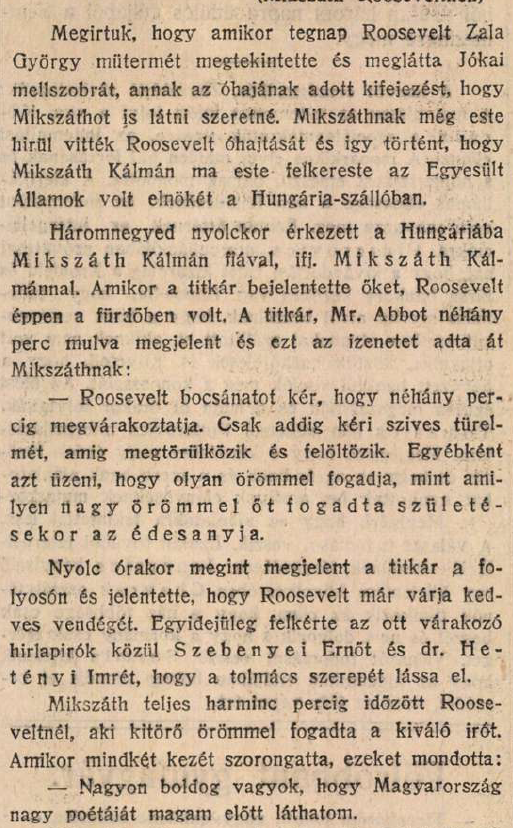 — Nagyon boldog vagyok, hogy Magyarország nagy poétáját magam előtt láthatom – mondta Roosevelt, amikor Mikszáth mindkét kezét szorongatta. Mikszáthot elkísérte a fia is, aki segített fordítani két hírlapíróval együtt.