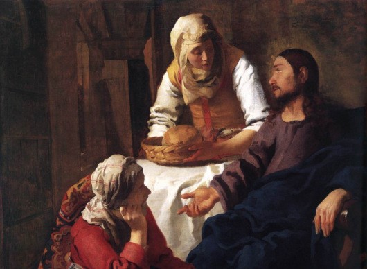 Vermeer: Jézus Márta és Mária házában (Forrás: Wikipedia)A szemünk előtt bontakozik ki a dráma. Még köztünk van Jézus, még tanít minket, még felhívja a figyelmünket a helyes fontossági sorrendre, de már azt is látjuk, hogy a háttérben mozgolódnak azok az erők, amelyek néhány nappal később az életére törnek.